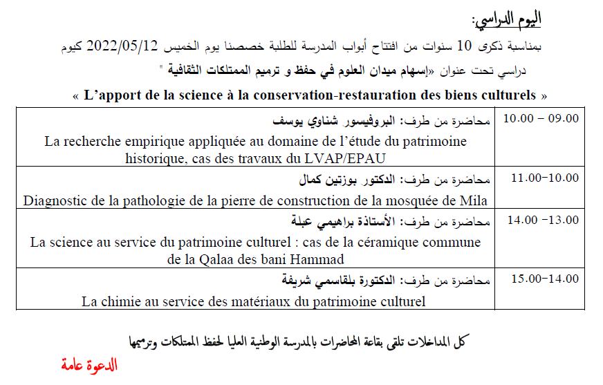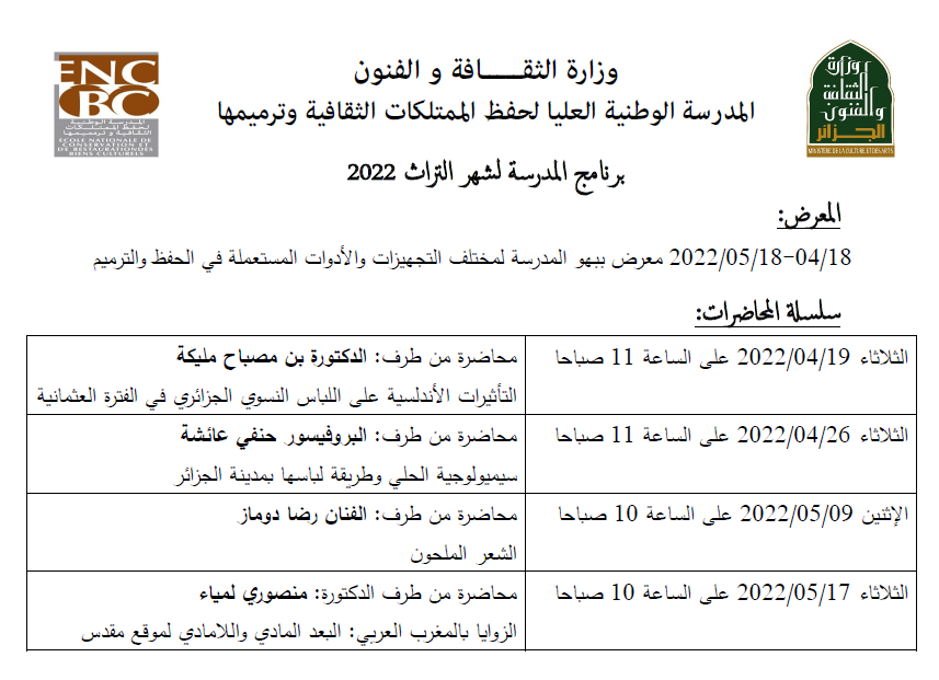 برنامج شهر التراث من18 أفريل إلى 18 ماي 2022 E.N.S.C.R.B.C. ACTUALITES 18 نيسان/أبريل 2022 الزيارات: 7307 Rating: ( 0 Rating ) لطفا قم بالتقييم صوت 1 صوت 2 صوت 3 صوت 4 صوت 5 السابق التالي