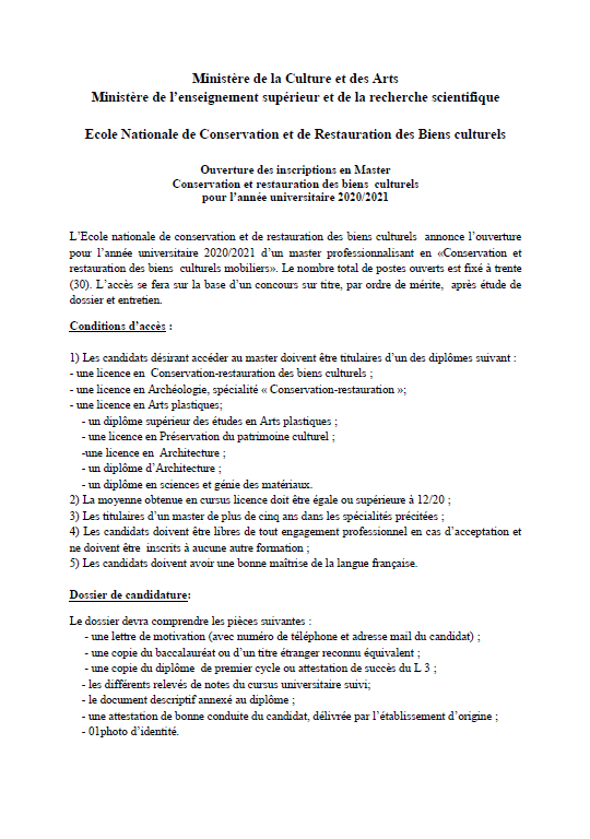 Chers nouveaux étudiants passionnés par le patrimoine,l’École Nationale Supérieure de Conservation et de Restauration des Biens Culturels a le plaisir de vous présenter ses nouveautés à l’occasion de la rentrée universitaire 2025-2026.